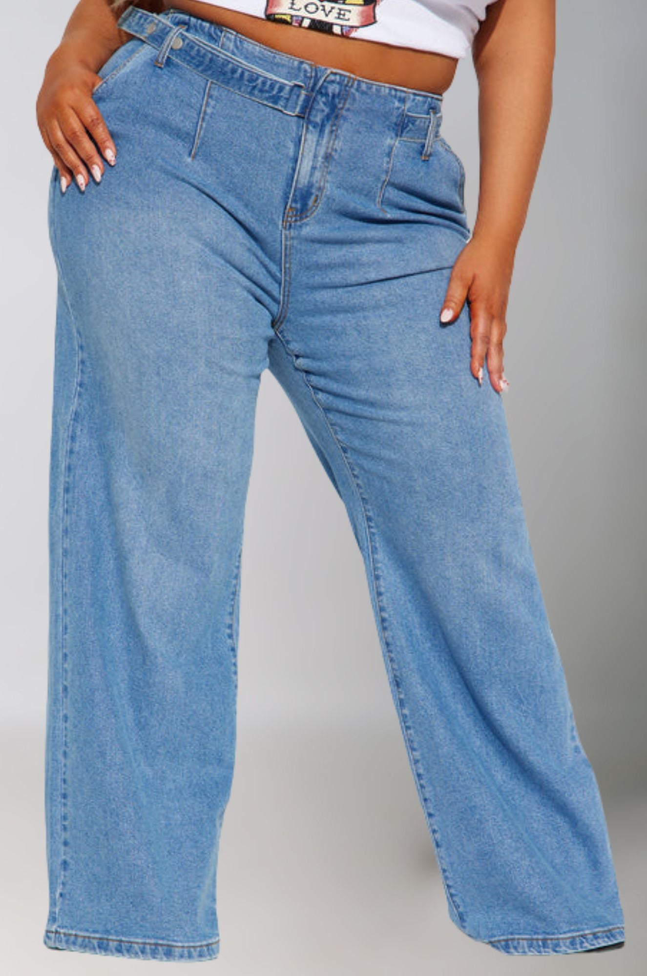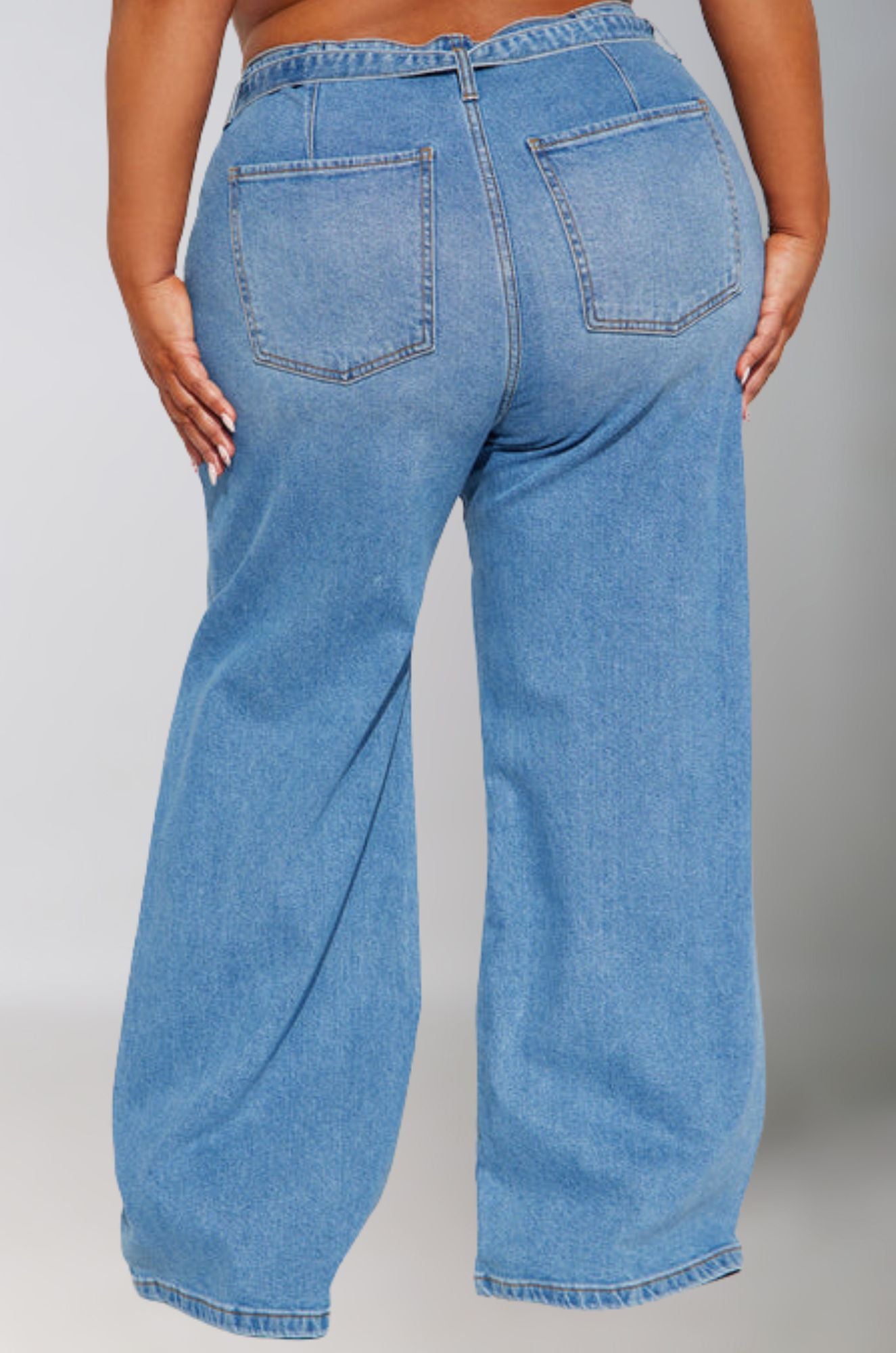 Details: Stretchy wide leg jeans with 4 pocket construction. 32 inch inseam, 10.5 inch high rise. Attached belt with snap detail to cinch / adjust waist. No waist band. Hook and eye and inner button closure within.