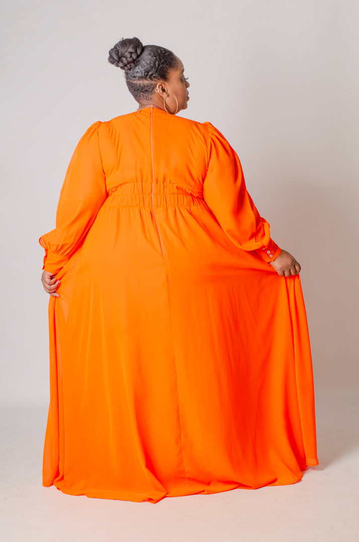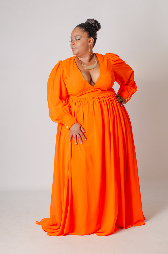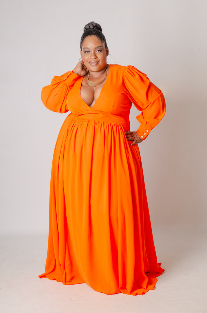 Details: Gorgeous full length maxi dress with long cuffed sleeves. Sexy Deep Plunge  neckline. Zipper entry.  Skirt is fully lined.