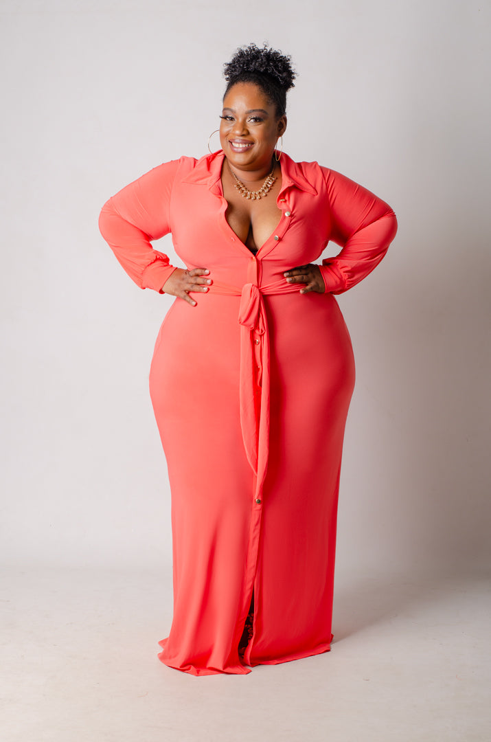 Details: Stretchy, comfy button down collared maxi dress with attached tie. Gold button Closure, Long Bishop sleeves.