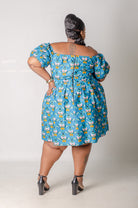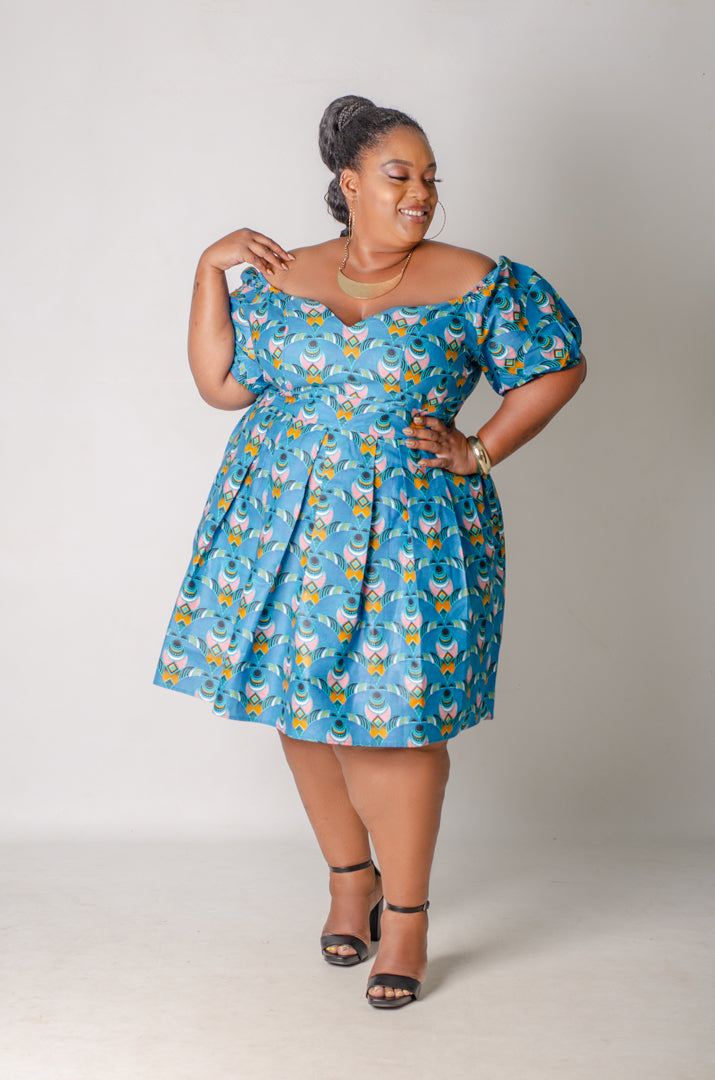 The Vibrant Soul Mini Dress is a whole celebration on its own. This stunning African print mini features an off-the-shoulder sweetheart neckline, playful puff sleeves, and a full pleated skirt that twirls with every step. The eye-catching geometric print in teal, orange, pink, and green on a bright blue base is the kind of pattern that stops traffic and starts conversations. Cinched at the waist with a flattering elastic detail, this dress hugs where it counts and flows where it needs to. Culture, curves, and confidence all in one look.