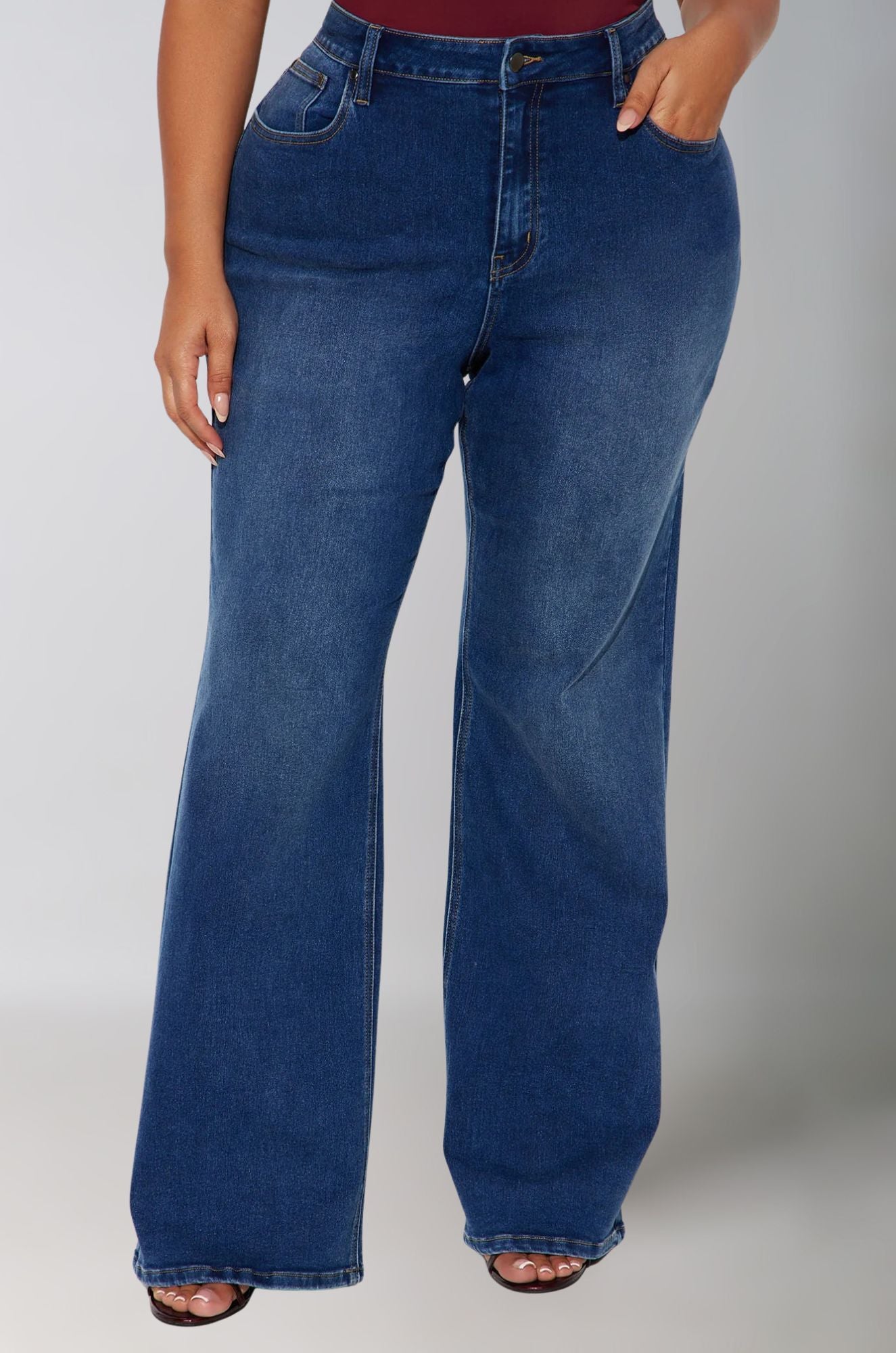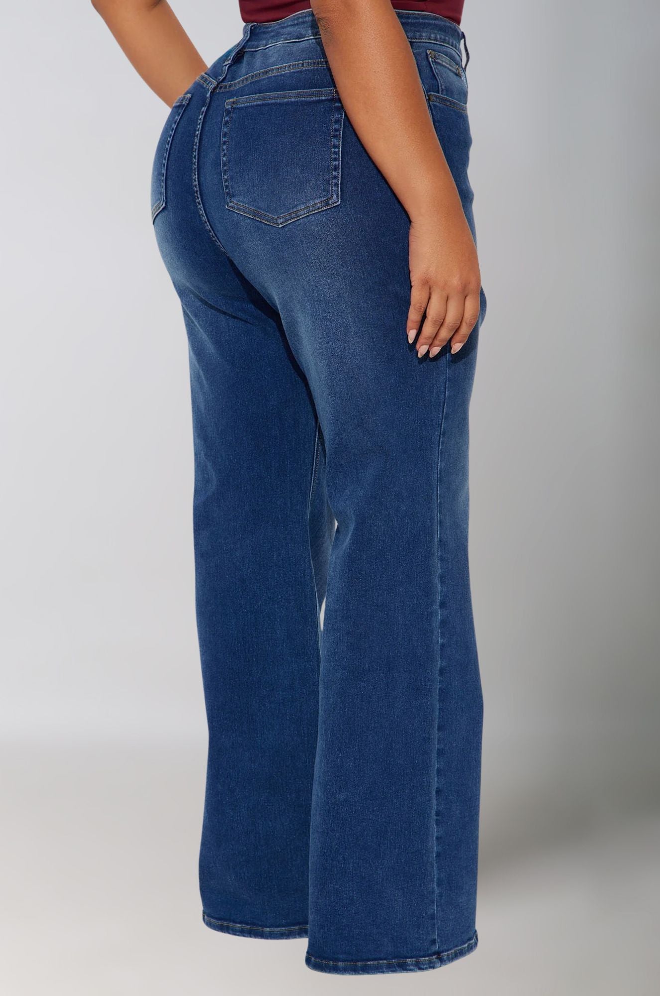 Details: Beautiful stretch wide leg jeans with 5 pocket construction. 33 inch inseam, 11 inch high rise. Zip and button closure. Dark wash and classic hem give a casual but classy edge.