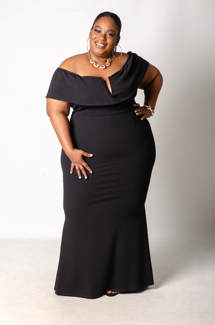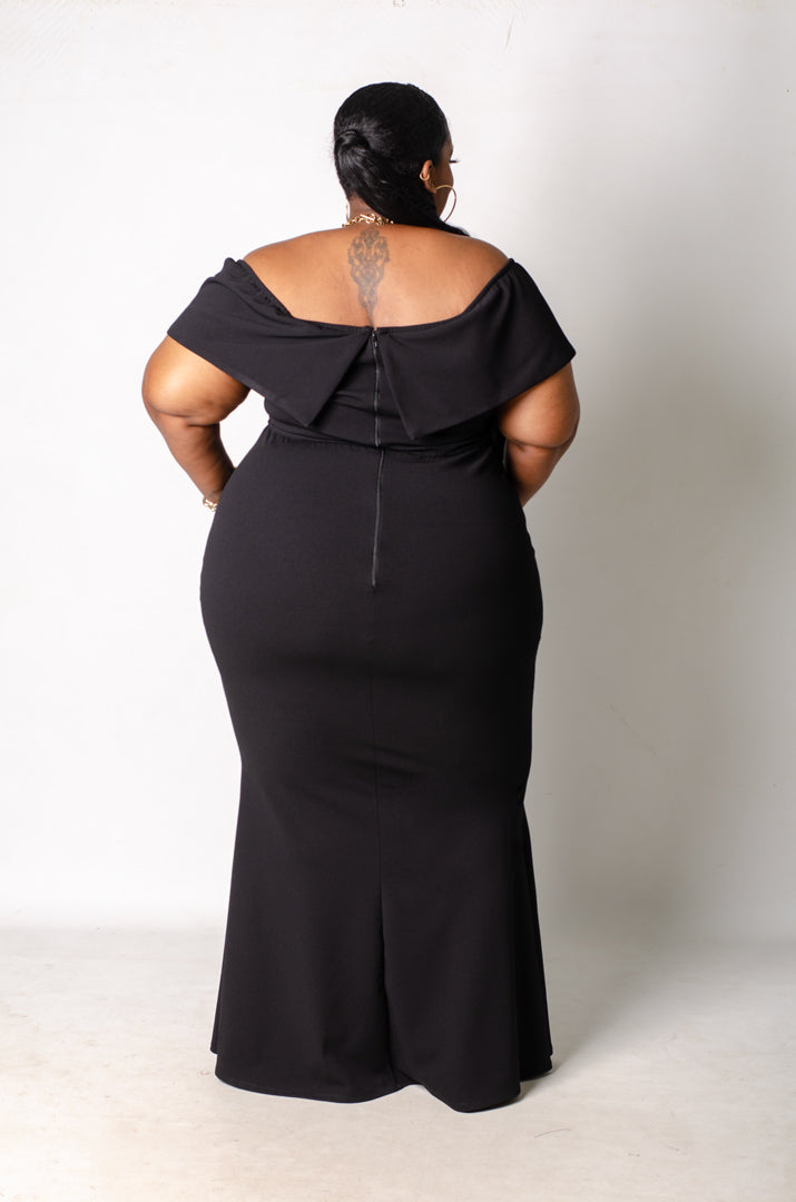 Details: Stunning mermaid silhouette dress (full length) with beautiful fold-over off-the-shoulder neckline with cheeky v-wire plunge. Zipper Entry.