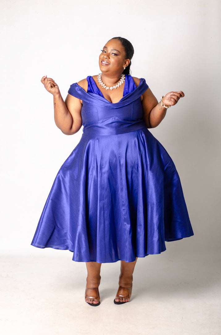 Indulge in the sophisticated decadence of our Gemstone Dress, featuring a beautifully draped off-the-shoulder design adorned with soft velvet straps. Delicate foldover detailing adds a touch of luxury, while the tea-length skirt and subtle zipper entry complete the elegant look.
