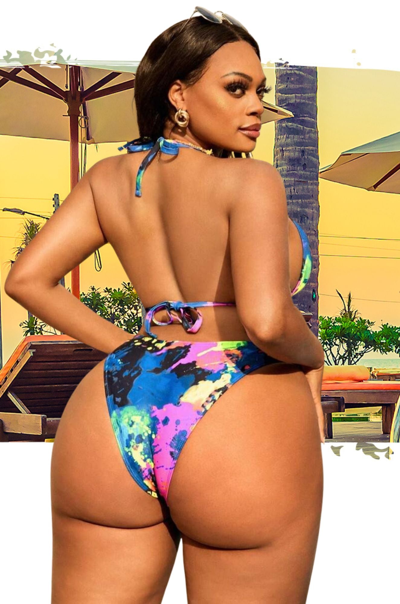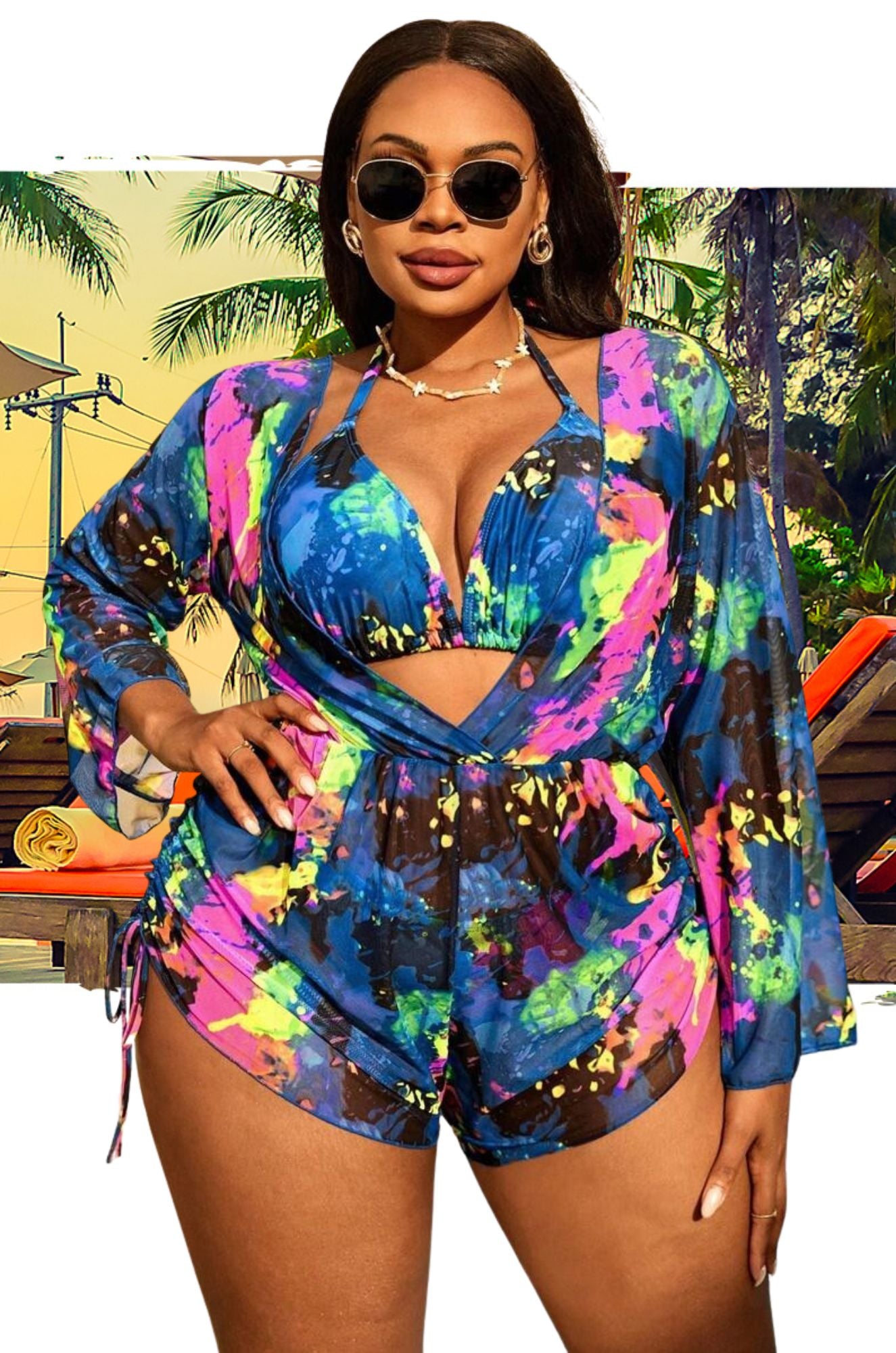 The cover-up features a plunge neckline and adjustable drawstring shorts, giving you just the right mix of coverage and allure. Finished in a neon splash print that pops against the water, this set is perfect for vacations, pool parties, and resort days where standing out is the vibe.