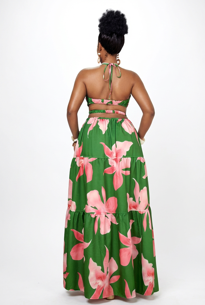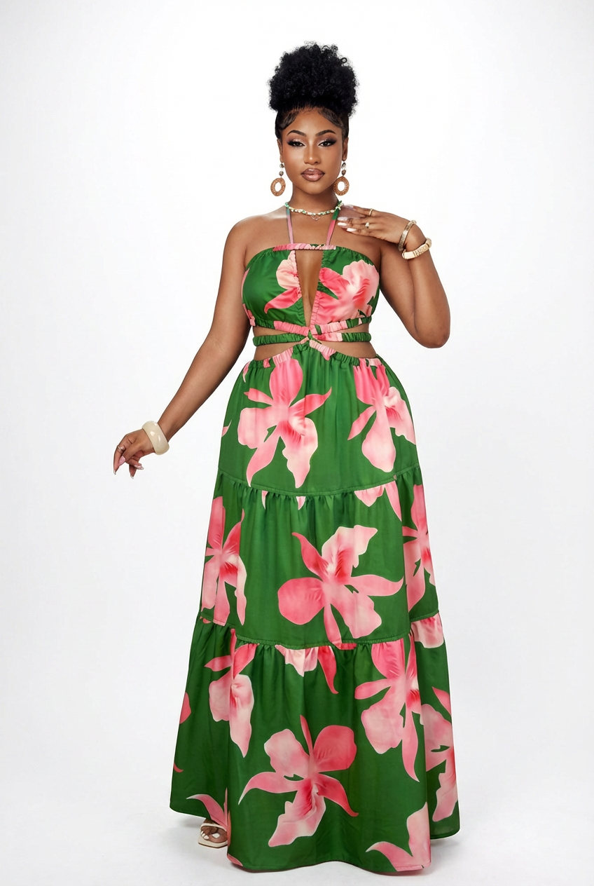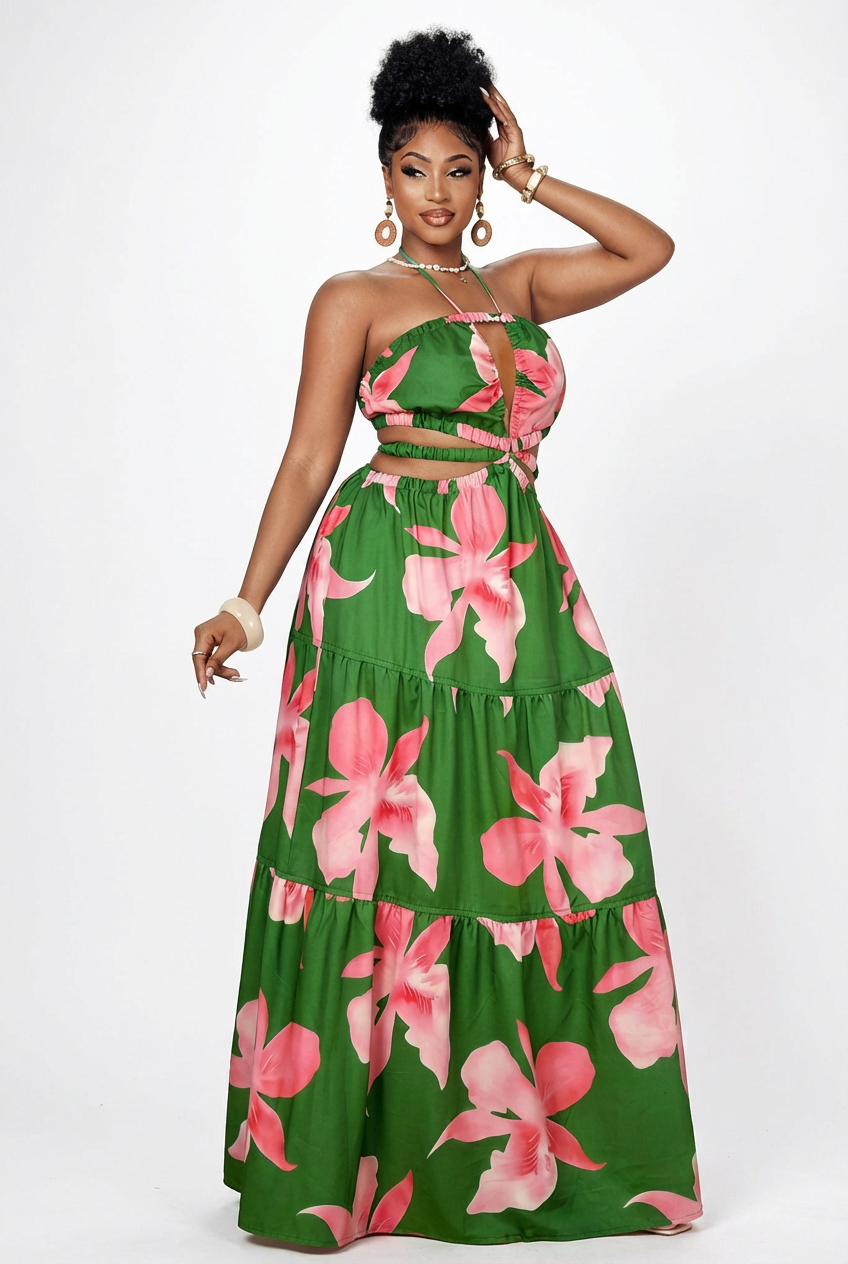 The Rio Flora Halter Maxi Dress is a tropical dream dressed up in the most beautiful way. That bold oversized floral print in vibrant pink and green is lush, dramatic and completely breathtaking, wrapping around a plunge halter neckline with an adjustable tie at the back that keeps everything secure and flattering. The open cutout waist gives a confident glimpse of skin while the shirred back bodice holds you comfortably in place, and the three tiered maxi skirt sweeps to the floor with effortless, flowing movement that makes every step feel like a moment.
