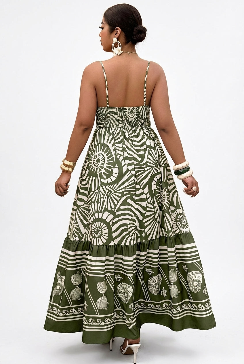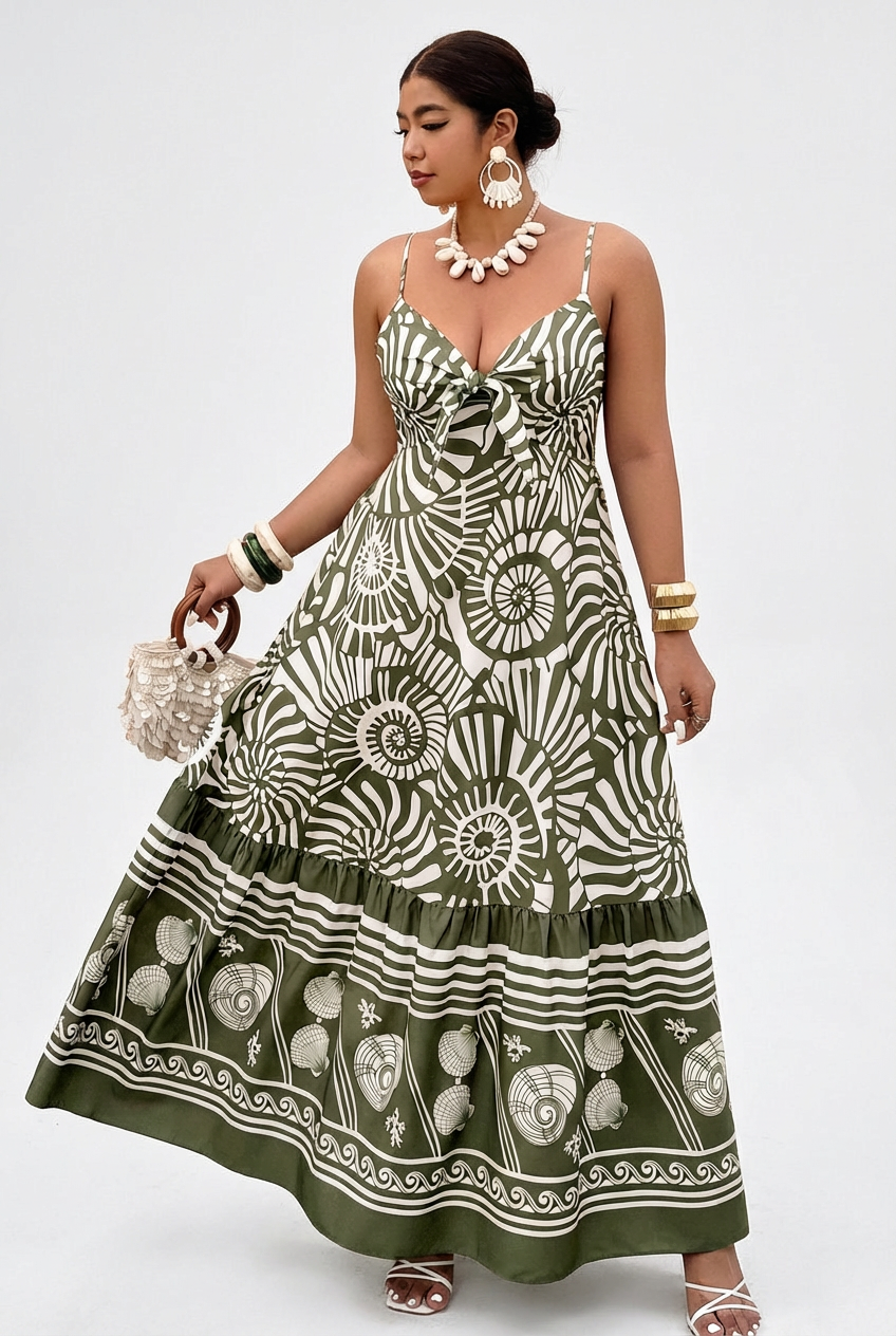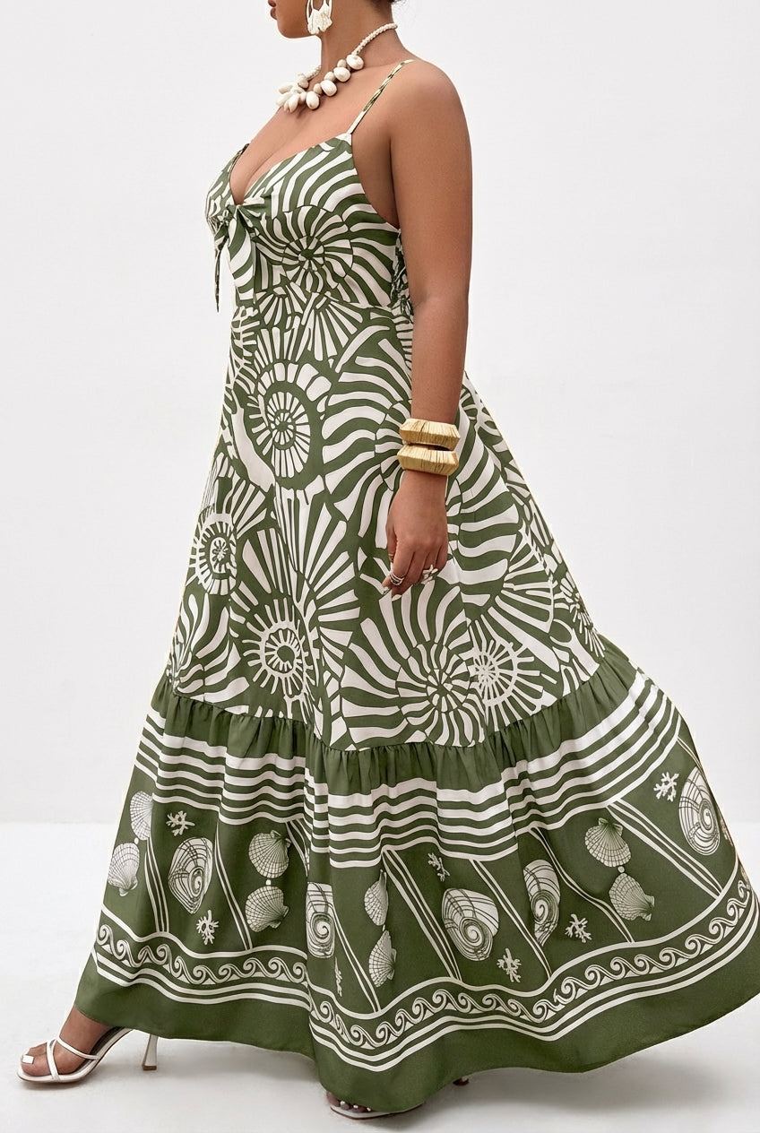 The Sea Scroll Maxi Dress is a love letter to the ocean. This breathtaking maxi features a deep V neckline with a flirty front knot tie detail at the bust, delicate spaghetti straps, and a low open back with a shirred elastic band that fits and flatters beautifully. The full tiered ruffle hem sweeps the floor with dramatic, effortless movement that turns every step into a moment. The intricate print tells a story from top to bottom, with bold abstract spirals and seashell motifs on the body transitioning into a stunning detailed seashell and wave border print at the hem. Rich olive green and crisp white come together for a look that is earthy, elegant and completely unforgettable.