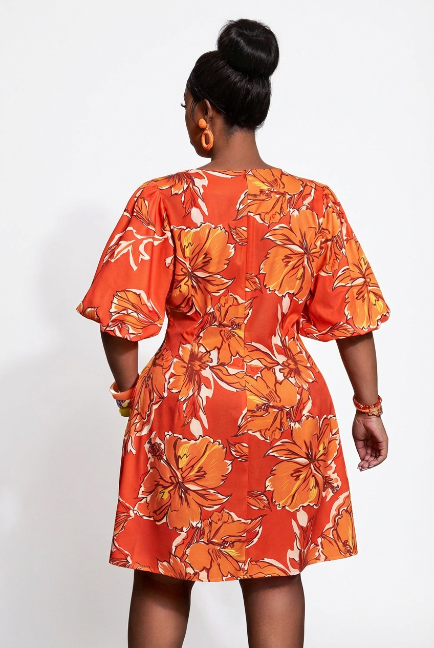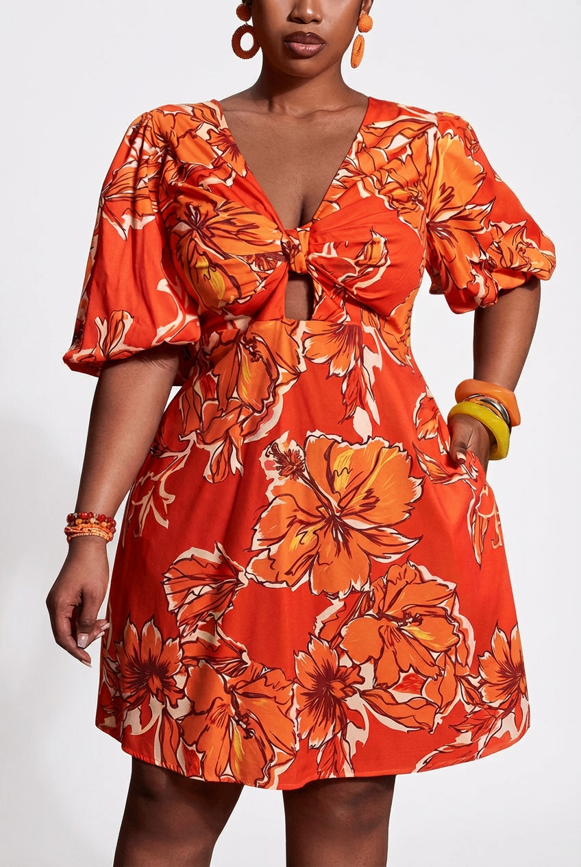 The Sunset Knot Mini Dress is pure sunshine wrapped in the most beautiful dress you have ever seen. This stunning mini features a deep V neckline with a flirty front knot tie cutout detail at the bust that adds just the right amount of drama, and dramatic puff sleeves that taper at the cuff for a look that is bold, feminine and completely fashion forward. The A-line skirt sits beautifully and moves with you every step of the way while the rich orange hibiscus print in orange, yellow and cream on a warm orange base makes this dress feel like wearing a Caribbean sunset. She is confident, cheerful and utterly unforgettable.
