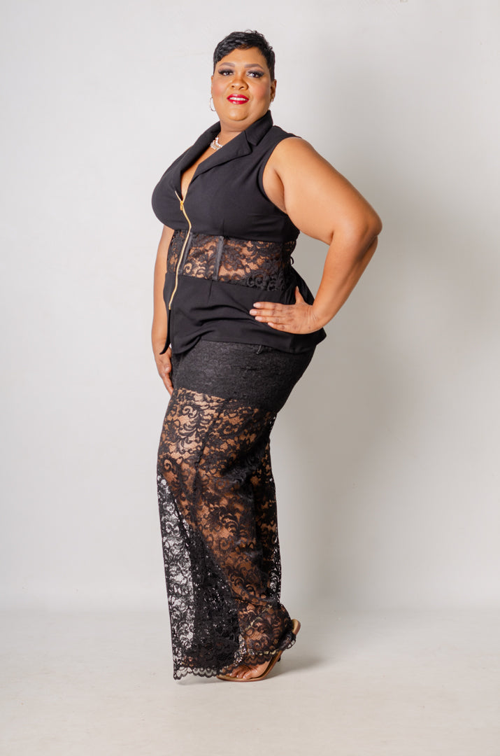 Details: Beautiful duo fabric pant set. Pants are wide leg lace pants with partial lining and an elastic waist. Top is a sleeveless jacket with plunge neckline and short zipper, a lace window, and a corseted back for a more customized fit at the waist.