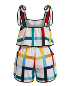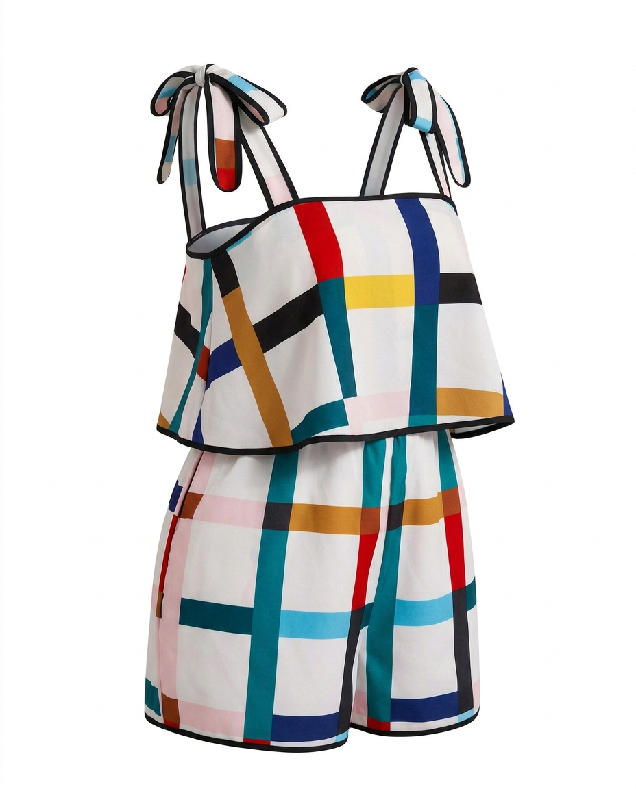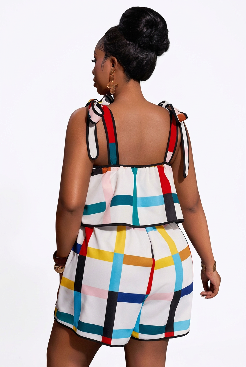 The Palette Check Romper is for the girl who never does boring. A vibrant multicolor geometric print in teal, red, yellow, blue, pink and black on a crisp white base makes this piece impossible to ignore. The flowy overlay top sits effortlessly over the shorts for a playful two-piece illusion, while the tie straps add a flirty, adjustable finish. Pair with white sneakers for a daytime look or dress her up with heeled sandals and gold accessories for a night out. Either way, you're the art. ✨