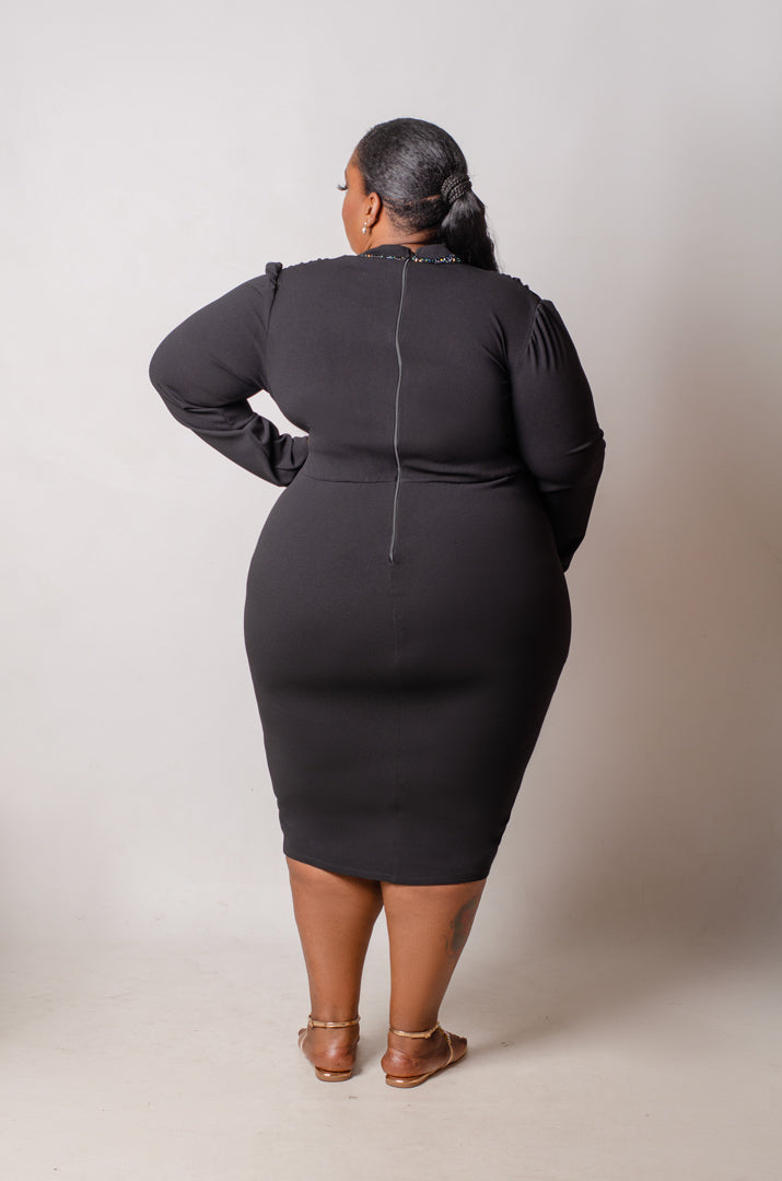 Sleek, sexy curve-skimming dress with embellished keyhole detail. Slight blousing at bodice, long Sleeves, Zipper Entry, Mock turtleneck.