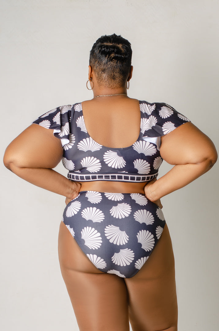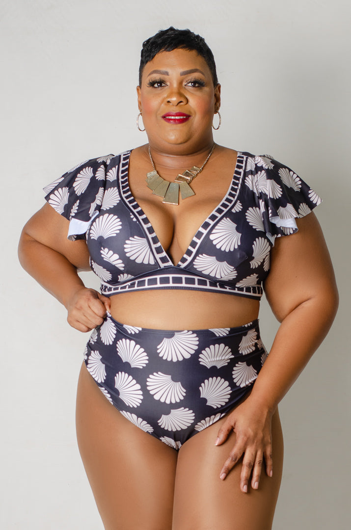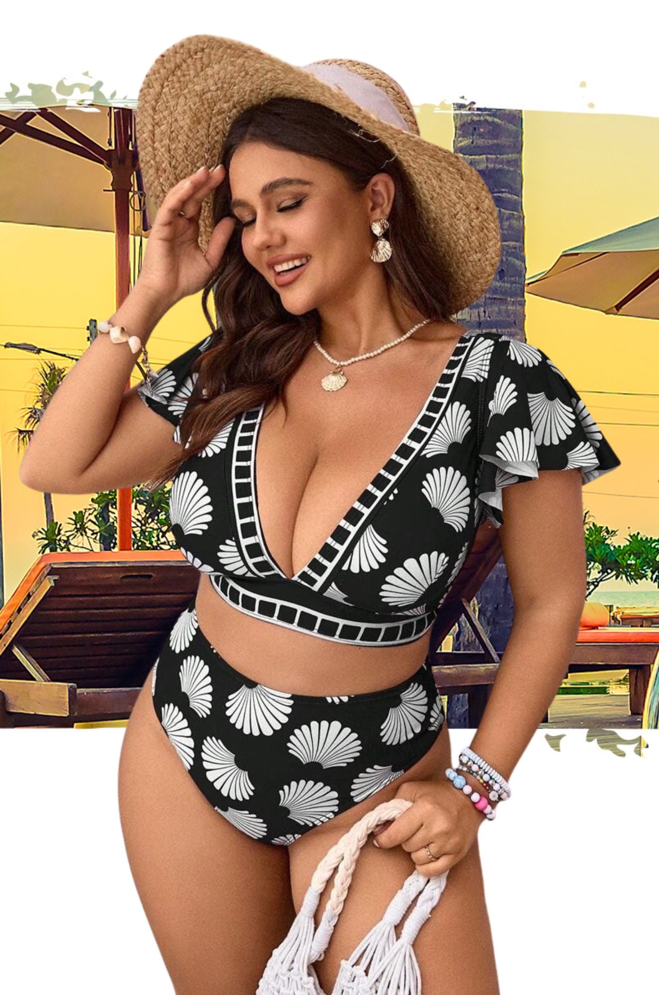 Details: Pretty two-piece swimsuit. The top is a plunge V-neckline with flutter sleeves in matching fabric. The bottom is a simple and comfy mid-rise brief.