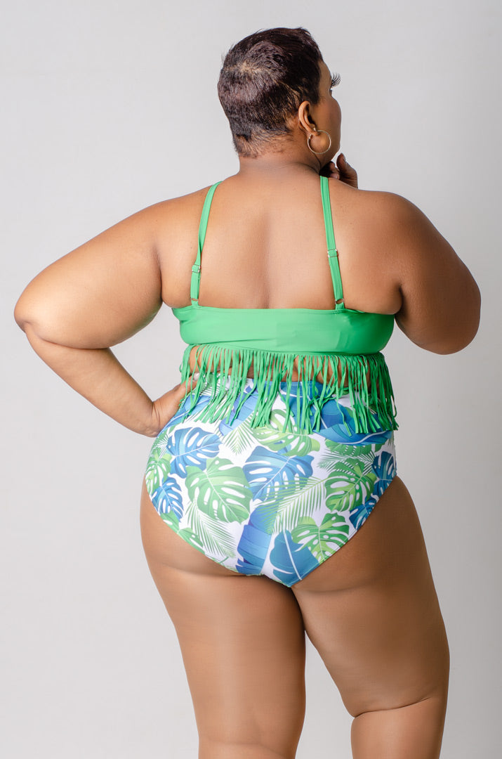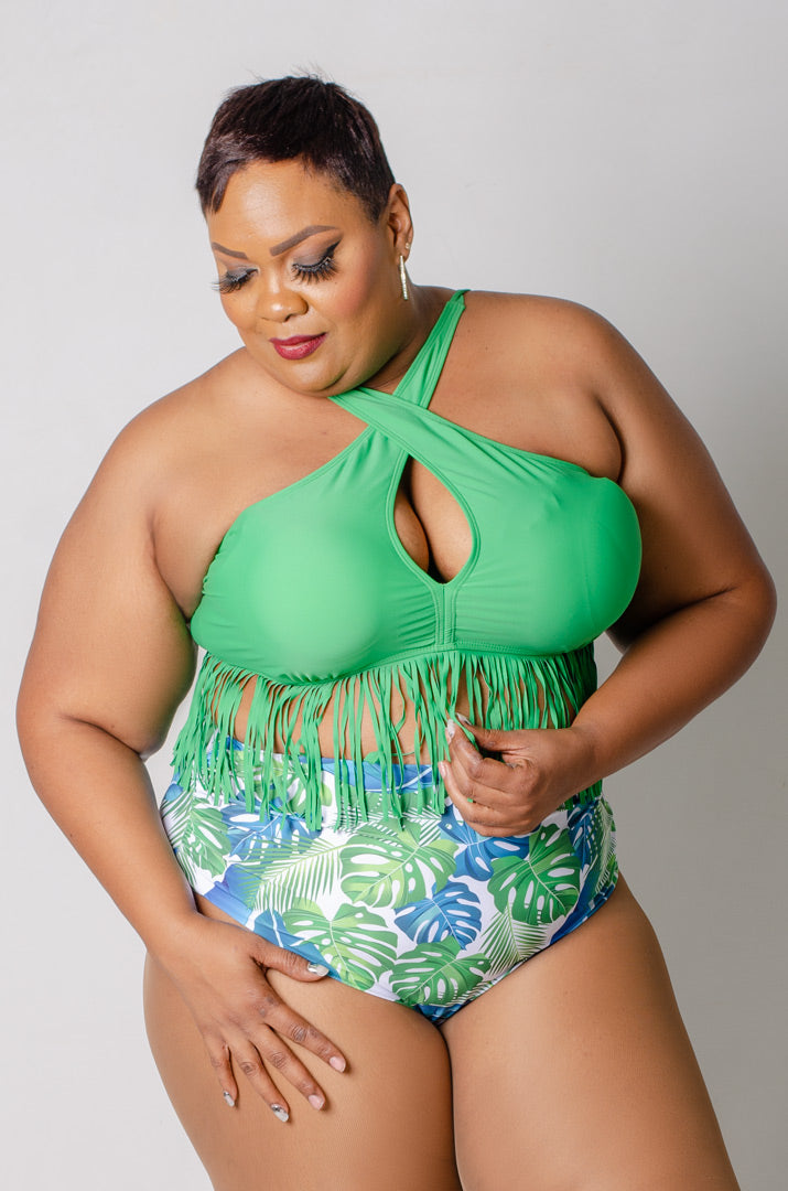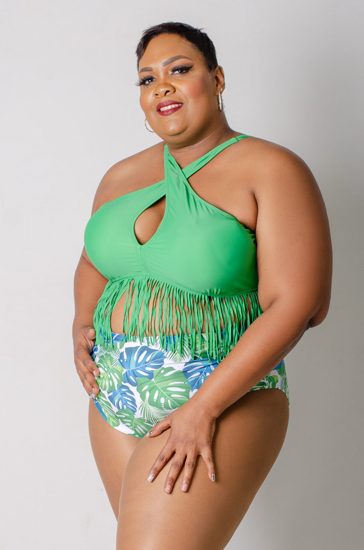 Details: Vibrant two-piece swimsuit with mix-and-match colouring. The top is a keyhole halter with fringe and adjustable straps. The bottom is a ruched printed high-waisted brief.