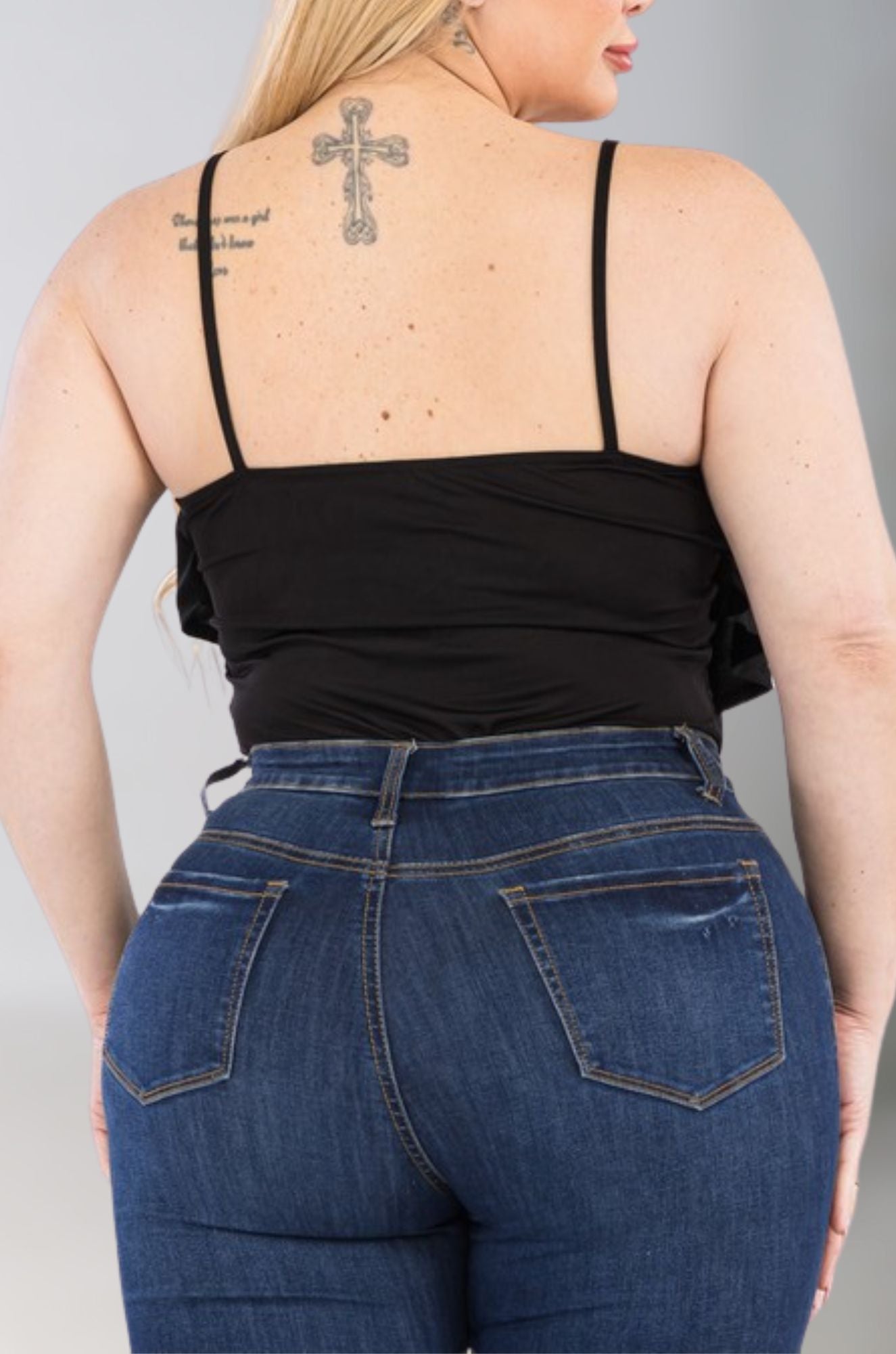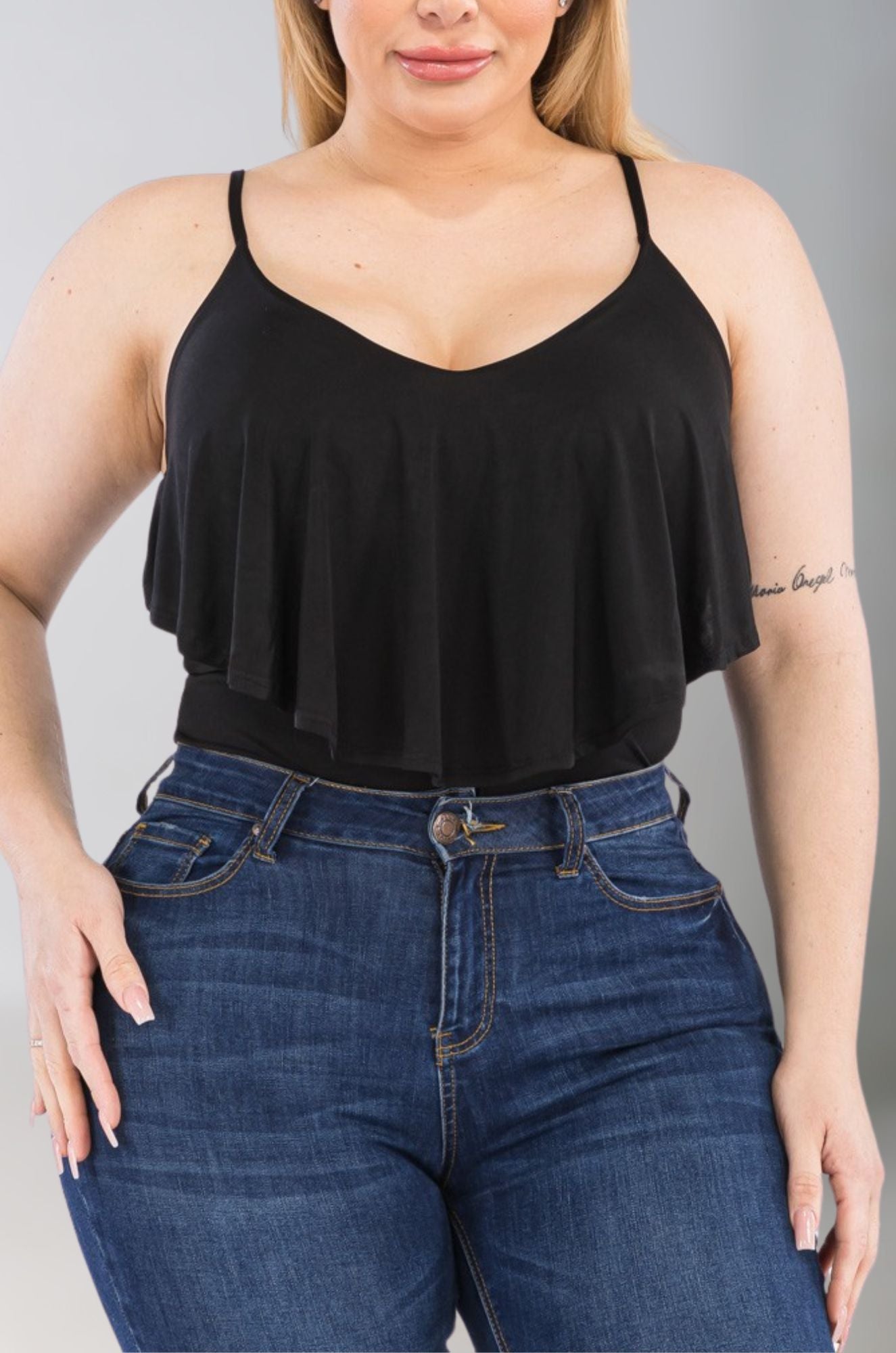 Details: Playful thin-strapped bodysuit with ruffle detail. Snap closure. Great under jeans, skirts or wide-leg pants.
