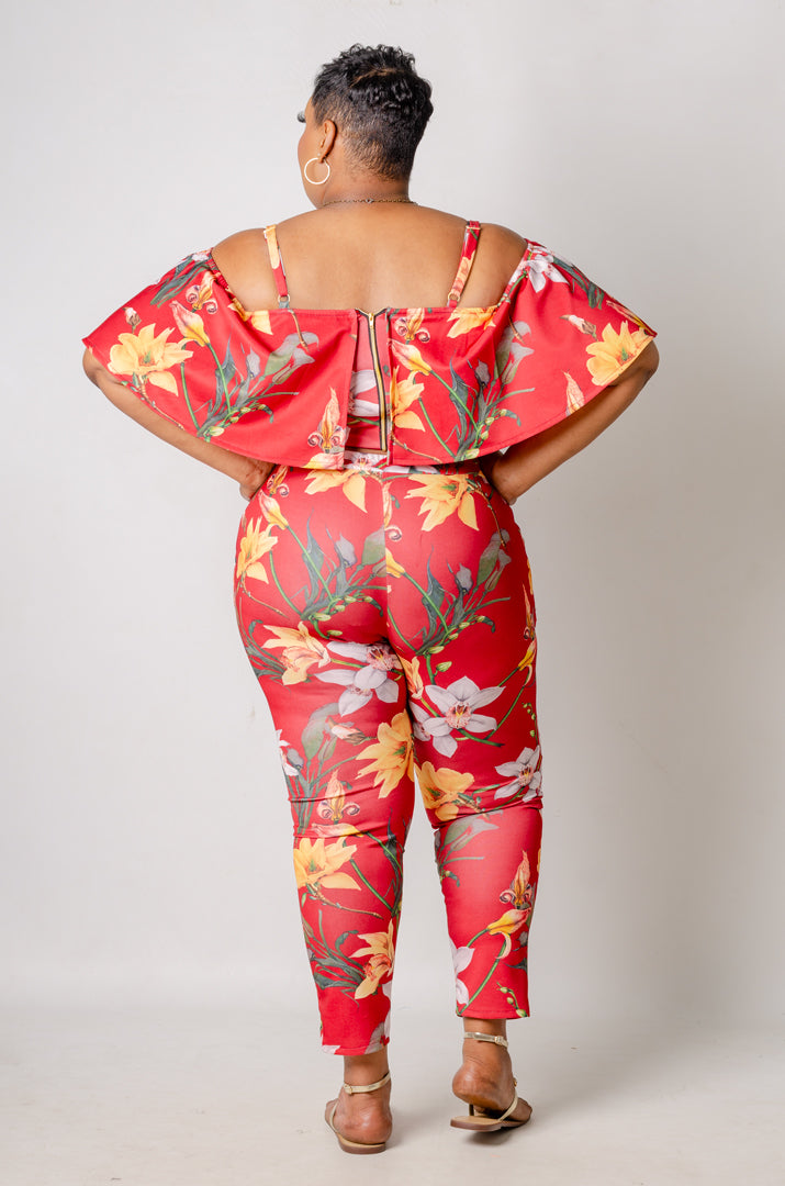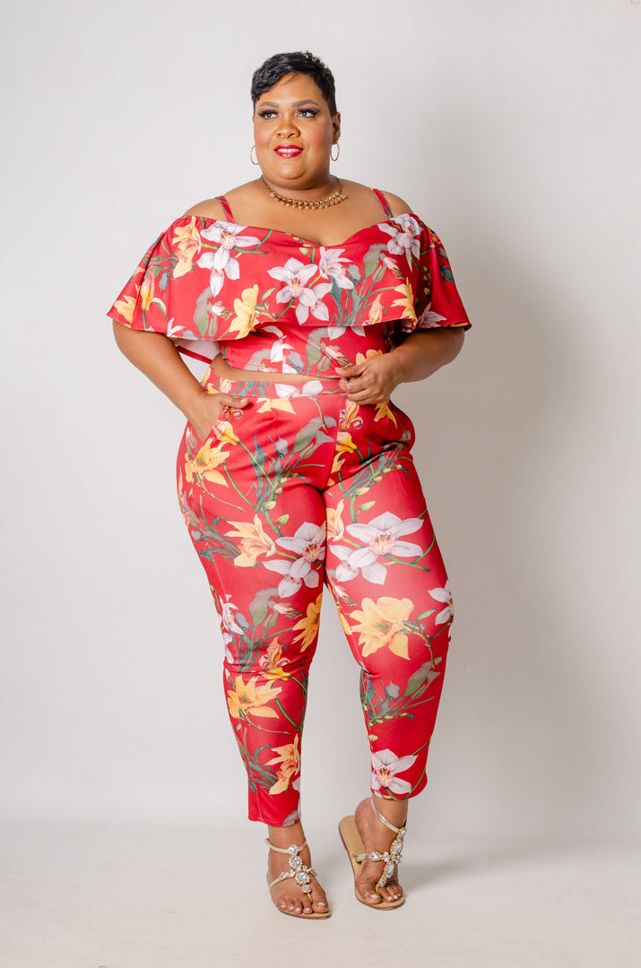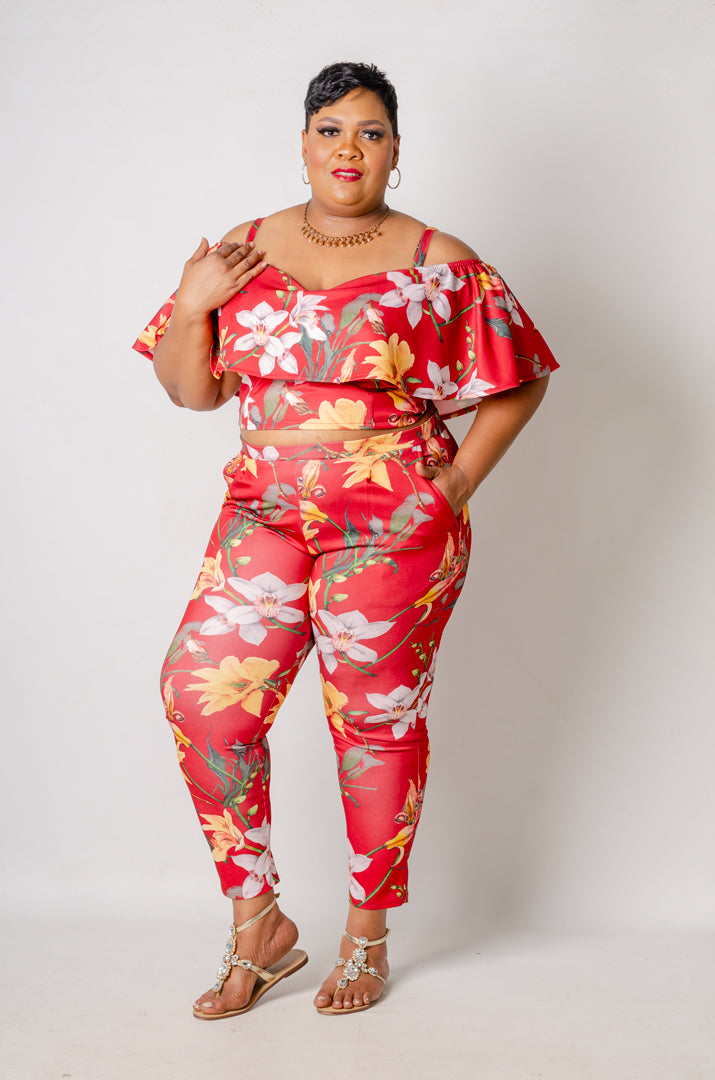 Details: Cute floral pant set. Top is cropped with a pretty off the shoulder ruffle detail and adjustable straps. Pants are cropped pencil construction (great for our petite ladies) with pockets and an elastic waist.