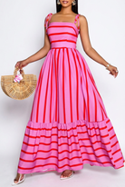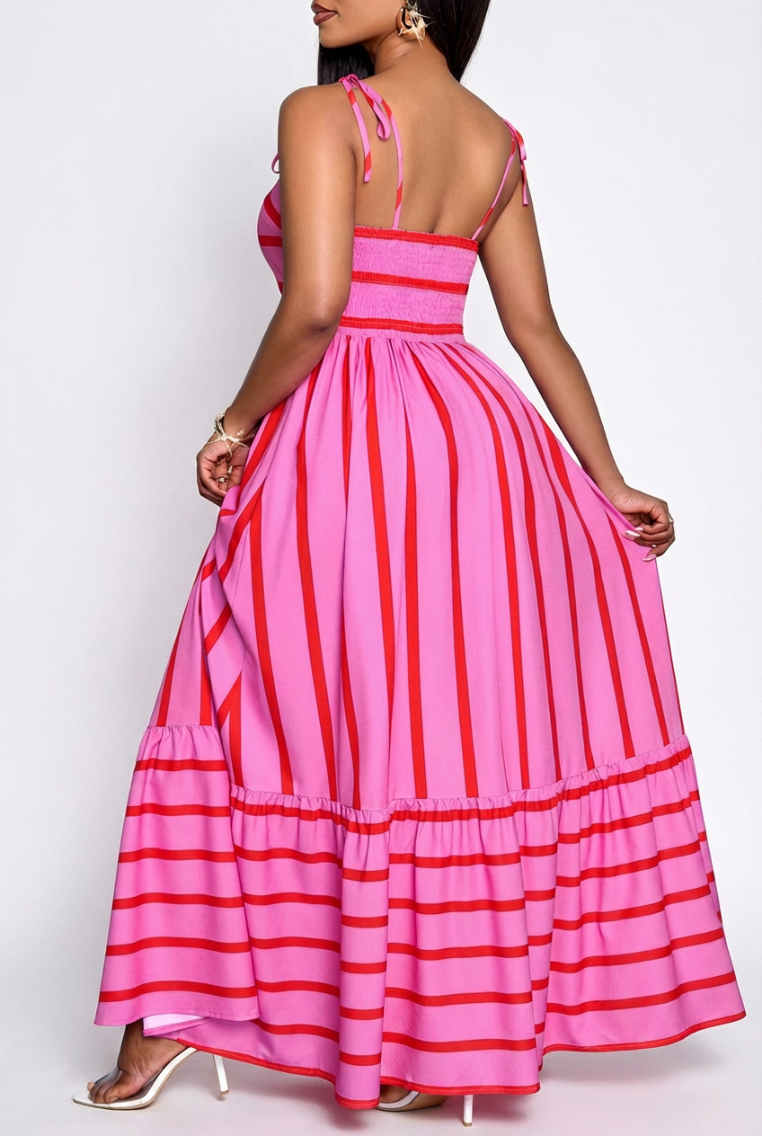 The Bon Bon Stripe Maxi Dress is pure joy from the shoulders down. That playful pink and red stripe print is bold enough to stop traffic and cheerful enough to brighten any room, while the clean straight neckline and adjustable tie straps keep everything looking polished and intentional. The shirred back bodice wraps you in comfort and holds you beautifully, while the full tiered skirt with its ruffled hem tier sweeps dramatically to the floor with every step. She's the dress that makes you smile before you even leave the house.