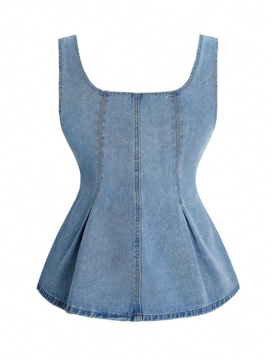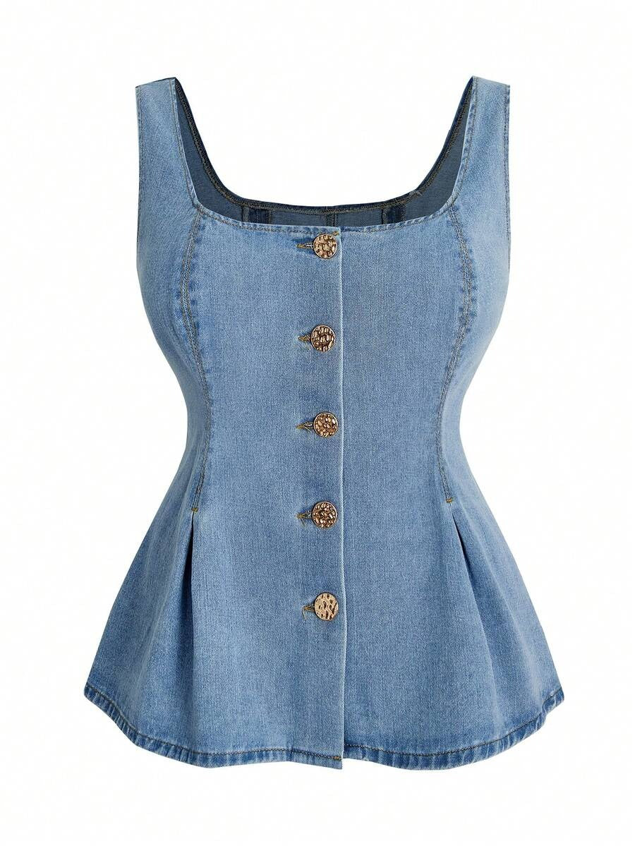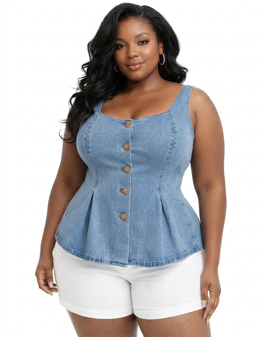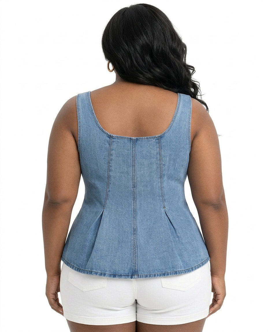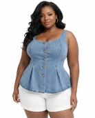 The Denim Reverie Peplum Top is the kind of top that makes you wonder why you ever wore anything else. The light-wash denim molds into a structured square neckline and fitted bodice, with princess seam detailing that creates a sculpted silhouette before flowing into a flared peplum hem that adds dimension. Decorative gold hammered buttons down the front add a luxurious touch that elevates this classic fabric into something truly special.