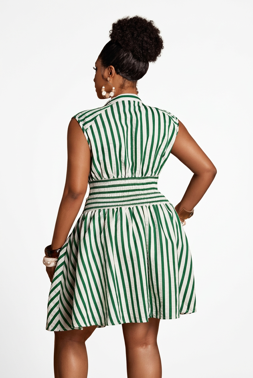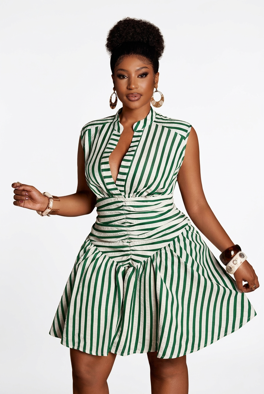 The Fresh Stripes Mini Dress is the kind of piece that looks effortless but hits every time. A crisp green and white stripe print, a daring plunge V-neckline, and a ruched waist that cinches and flatters before flaring out into a flirty full skirt. Sleeveless and structured, she's giving garden party, yacht club, and brunch date all at once. Pair with strappy heels and gold hoops for a polished look, or white sneakers and a blazer to take her from casual to chic in seconds.