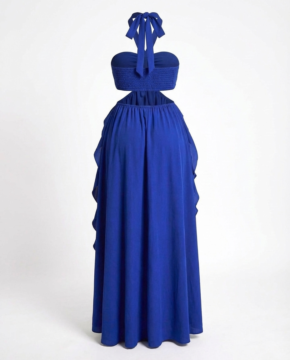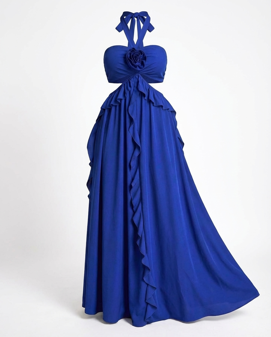 The La Fleur Halter Maxi is pure drama and femininity wrapped into one unforgettable look. This stunning royal blue maxi features a halter tie neckline, a gorgeous 3D rose detail at the bust, and a midriff cutout that adds just the right amount of boldness. The shirred back bodice hugs and flatters while the dramatic ruffled front slit skirt flows into a full maxi length that moves like a dream. From the front she is breathtaking. From the back she is everything. This is the dress you wear when you want to make a moment.