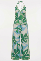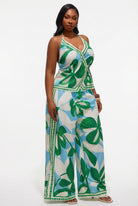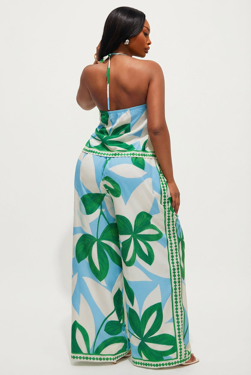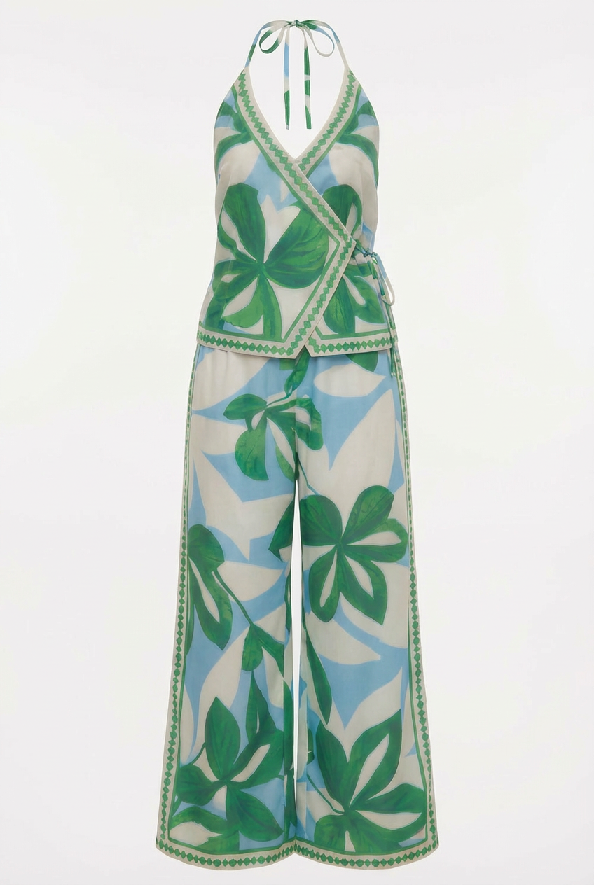The Lush Garden Pant Set is giving luxury resort and we are completely here for it. This stunning co-ord features a deep V wrap halter crop top with a flirty front tie detail, a soft peplum hem, and an open back with halter tie that keeps things breezy and beautiful. Paired with dramatic ultra wide leg palazzo pants that flow all the way to the floor, this set is polished, feminine, and effortlessly chic from every angle. The bold oversized leaf print in rich green and white on a soft blue base is elevated by a gorgeous geometric border trim detail that adds a luxurious, tailored finish. Lightweight, airy, and made to move beautifully, the Lush Garden Pant Set is your next favourite occasion outfit.