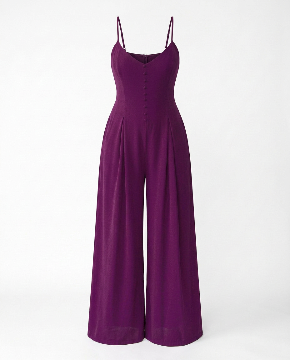 The Majesty Wide Leg Jumpsuit is elegance and edge in one stunning piece. This rich jewel-toned purple jumpsuit commands attention from every angle with its sweetheart neckline, delicate spaghetti straps, and faux button-front detail that adds a polished, put-together finish. The shirred back ensures a comfortable, flexible fit while the dramatically wide pleated legs flow and sweep with every step, giving you that effortless, elevated look that works just as hard at a dinner date as it does at a special occasion. She has pockets too. You're welcome. 💜