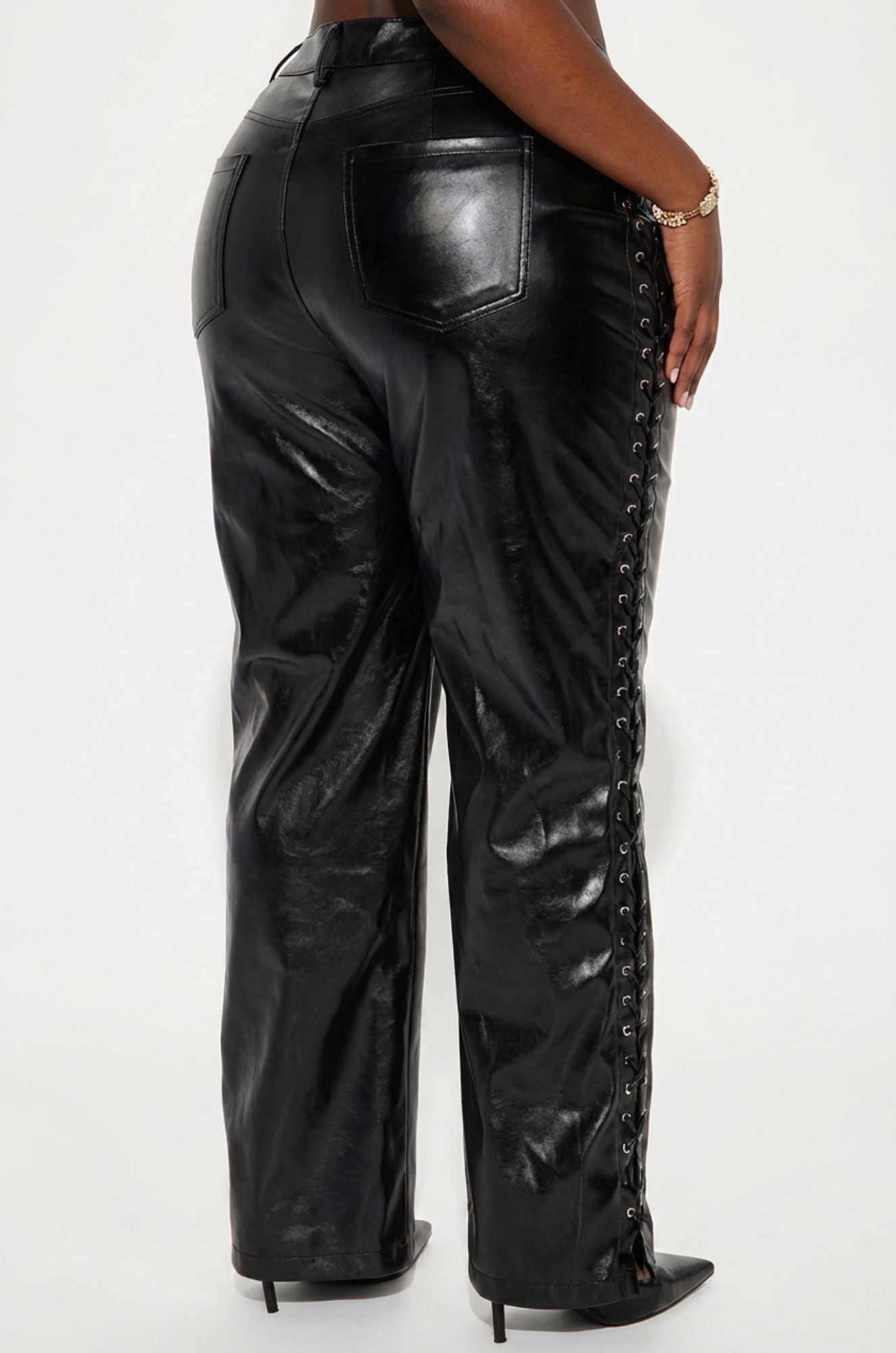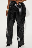 The Phantom Lace-Up Wide Leg Pants are for the woman who shows up and shuts it down every single time. That striking textured patent faux leather catches the light in all the right ways, while the full-length side lace-up detailing running down both legs takes this silhouette from bold to absolutely unforgettable. The high waist with hook and bar closure and zip entry keeps everything sleek and secure, while the wide leg silhouette elongates and flatters every curve with effortless drama.
