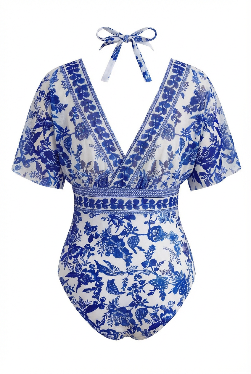 The Santorini One Piece Swimsuit is the kind of one piece that makes people stop and stare. Inspired by the beauty of classic blue and white porcelain, this stunning swimsuit features a simple halter one piece base with a gorgeous attached mesh batwing overlay in the same exquisite floral botanical print that drapes beautifully over the arms and shoulders. The cinched waist with a decorative border trim detail defines your silhouette beautifully while the deep V open back with halter tie keeps things elegant and alluring from every angle. Fully lined with removable padding for customisable support and comfort, this is the swimsuit for the woman who brings sophistication to the shoreline.