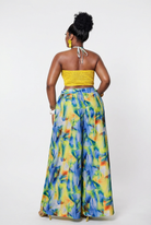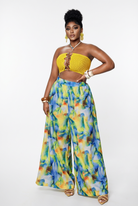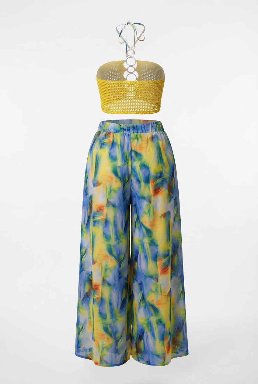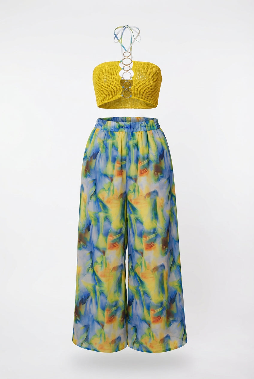 The Sun and Sea Two Piece Set is a whole mood from head to toe. The vibrant yellow crochet knit bandeau crop top features a stunning multi-ring chain detail at the centre front that adds just the right amount of drama, and a halter tie at the back for an adjustable, secure fit. Pair it with the dramatic ultra wide leg palazzo pants in a dreamy watercolour abstract print in blue, yellow, green and orange that flows and sweeps with every step. Bold on top, breezy on the bottom, and completely unforgettable as a set.