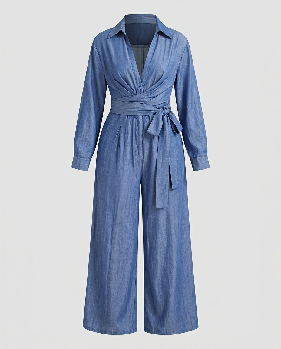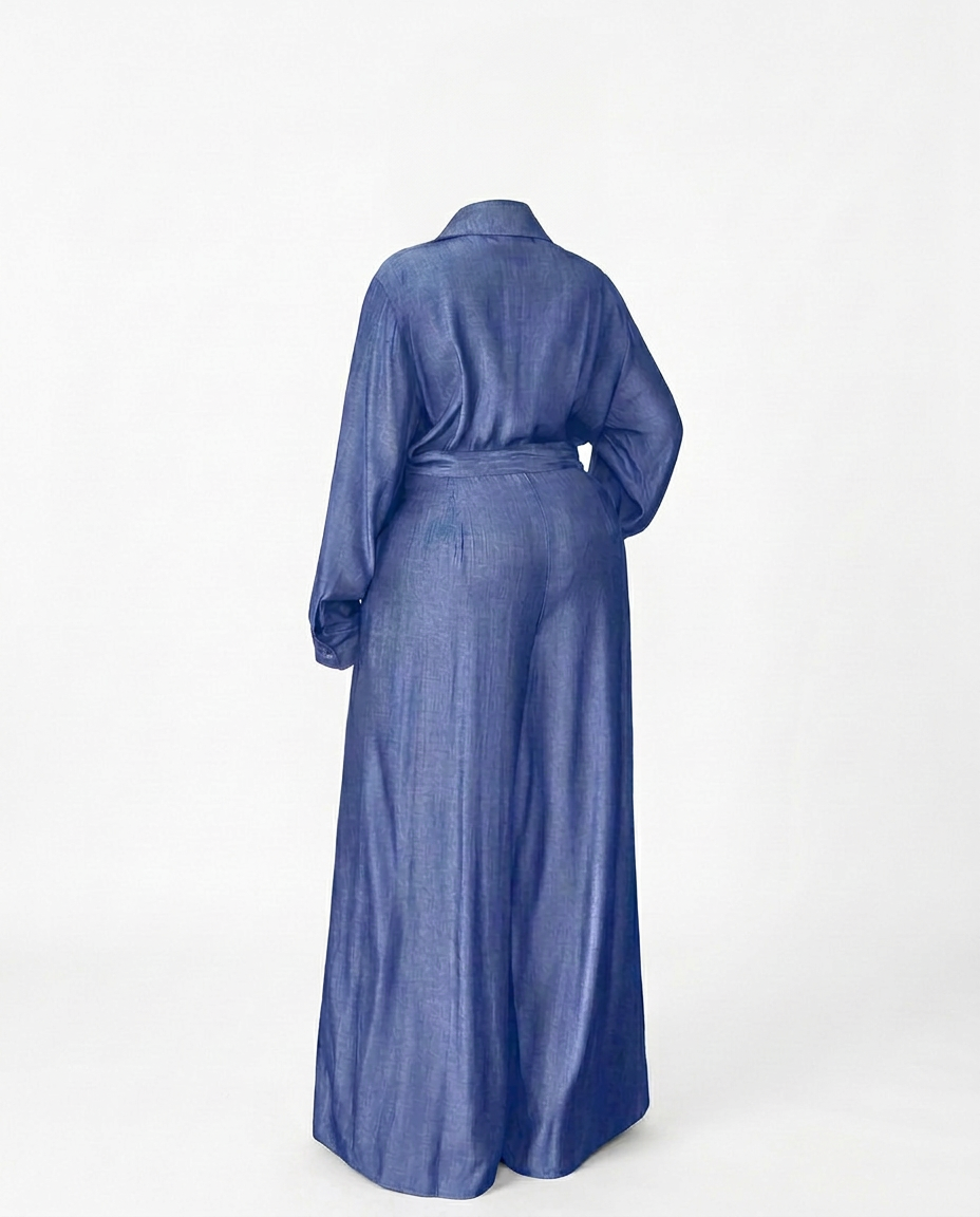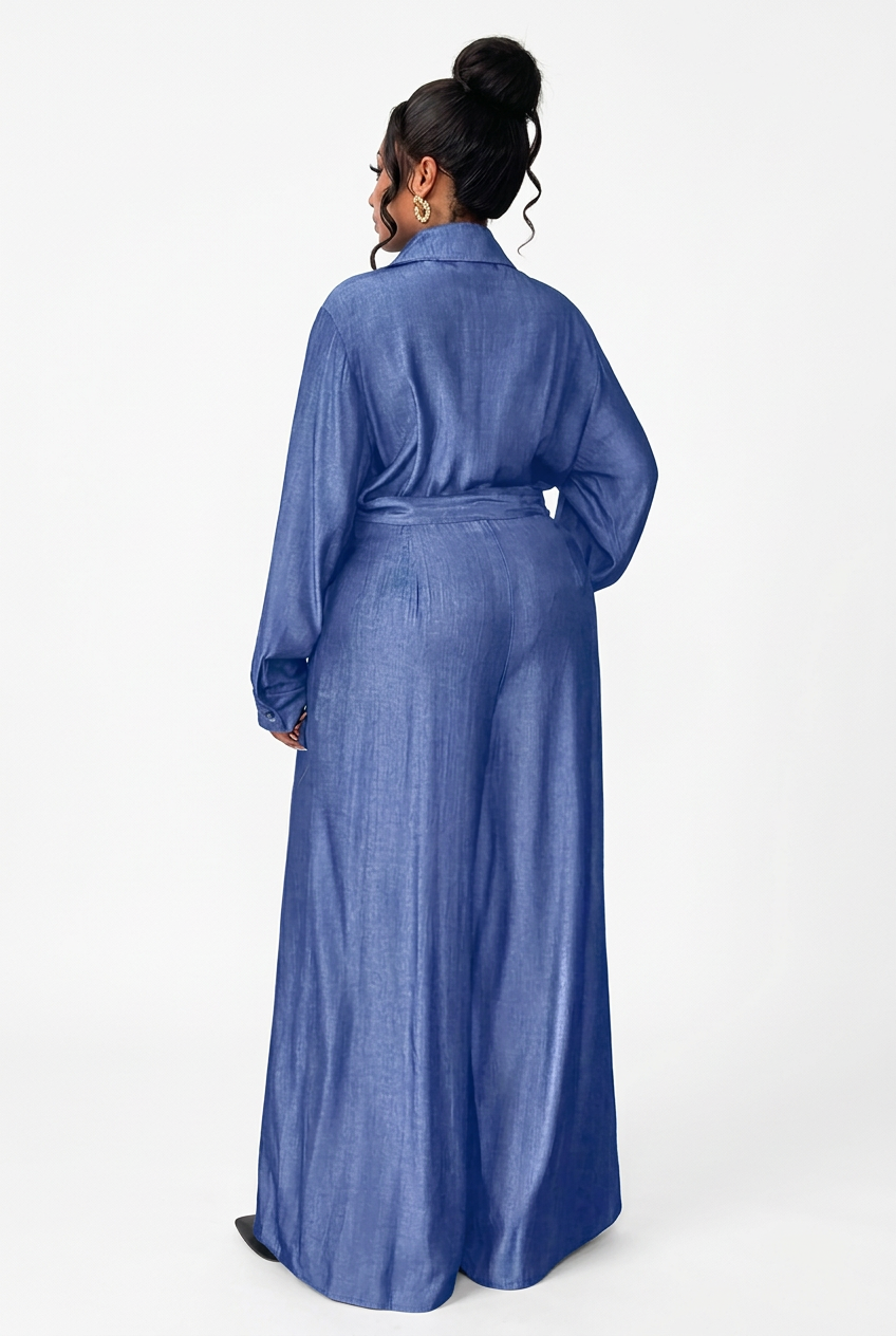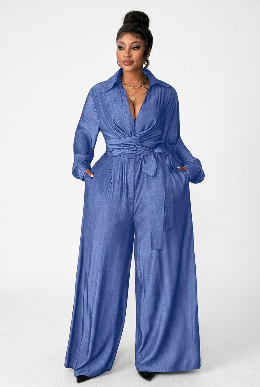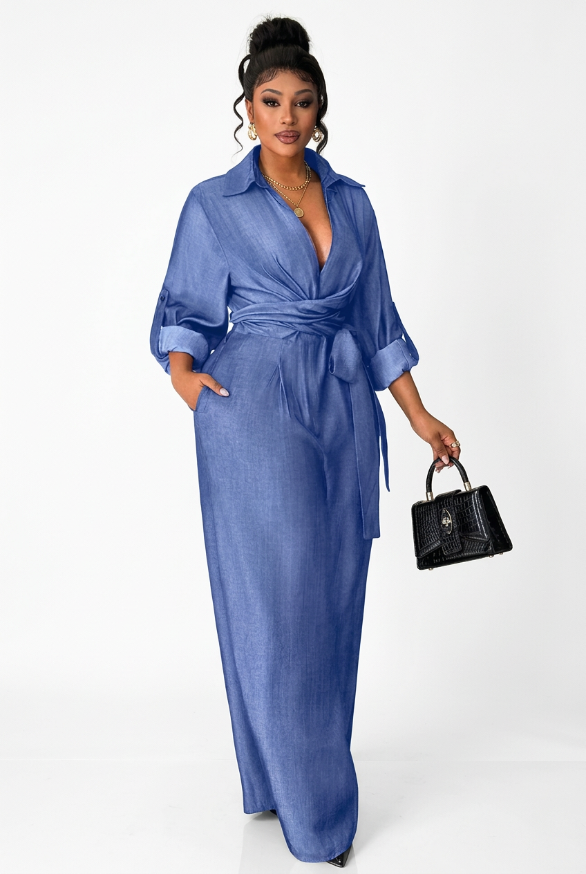 The Blueprint Jumpsuit is the ultimate elevated casual piece. Crafted in a smooth woven chambray, this beauty means business with a wrap-style crossover bodice, a plunging V-neckline, and a self-tie belt that defines the waist on your terms. The wide leg silhouette flows effortlessly from a high waist for a long, lean, and completely polished look.