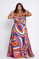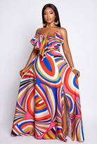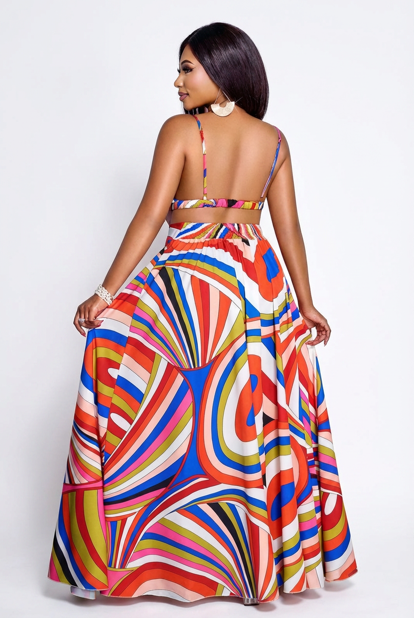 The Vortex Ruffle Two-Piece Set is not for the faint of heart, and that is exactly the point. That bold swirling abstract print in a riot of colour commands every room it enters, while the ruffled crop top with its spaghetti straps and open back keeps things flirty and feminine. The matching high waist maxi skirt with its elasticated waistband sits beautifully and drapes to the floor with a front slit that adds just the right amount of drama to every step. Together they create a look that is completely, unapologetically unforgettable.